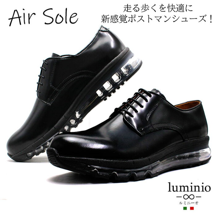 イタリアンデザインで定評のあるluminioシリーズの本革ポストマンフルレングスエアユニット搭載シューズ 多様化するビジネスに対応する「走れる」スニーカーやウォーキングシューズ、 アメリカなどでよく使われるエアーソールを用いて 「軽さ」「履き心地の良さ」「ガラス加工本革」「通気性」「屈曲性」のビジネスシューズです。